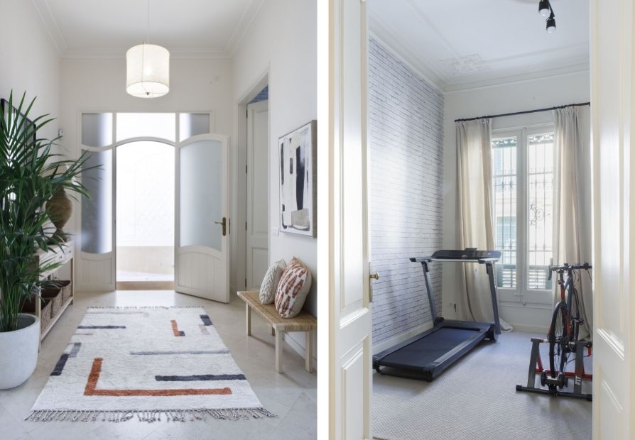 En viviendas urbanas como esta, el reto está en optimizar cada metro cuadrado. Ubicar un pequeño gimnasio en zonas de paso, como la entrada, puede ser una solución ingeniosa. Equipamiento plegable, espejos estratégicos y mobiliario integrado permiten crear un rincón funcional sin renunciar al estilo ni a la coherencia del conjunto, y sin necesidad de contar con una gran superficie.